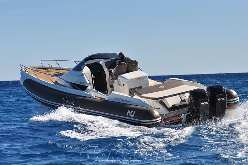 La tuga slanciata e arrotondata del Nuova Jolly Prince 38 Sport Cabin preannuncia le sue prestazioni. Equipaggiato con due Mercury Verado 400R lo portano a 48 nodi di velocità massima e può tenere andatura di crociera elevate anche sul mosso grazie alla carena con «V» molto profonda.